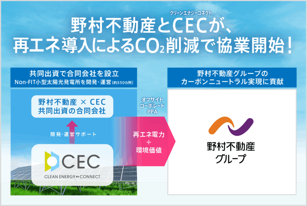 本取り組みでは、野村不動産グループのカーボンニュートラルの実現に向け、野村不動産とクリーンエナジーコネクトが共同出資により、発電・PPA事業を行う合同会社を設立します。