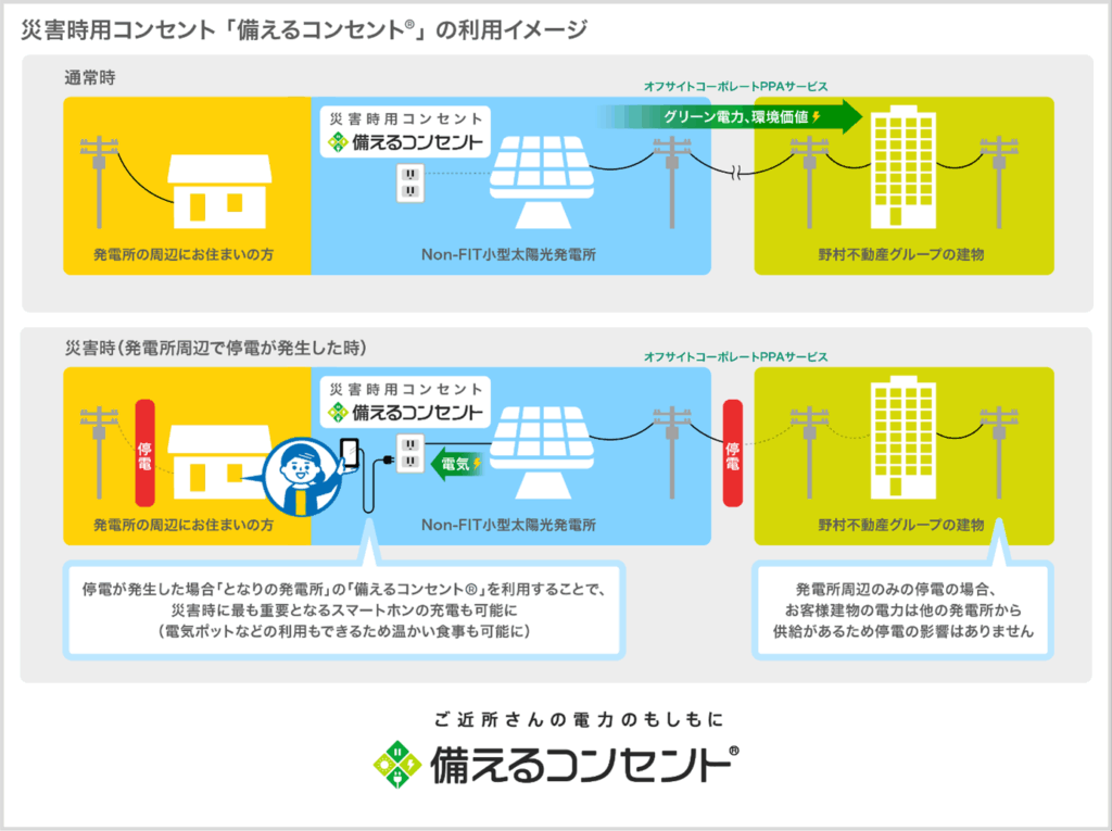 また、今回開発する野村不動産グループ専用のNon-FIT小型太陽光発電所には、クリーンエナジーコネクトが提供する「備えるコンセントⓇ」を導入しています。「備えるコンセントⓇ」とは、発電所の設置地域で災害等により停電が発生した際、周辺にお住まいのみなさまが太陽光発電で発電した電気を利用することができる、災害時用コンセントです。これにより、発電所の設置地域における災害時の停電対策(レジリエンス向上)に貢献することを目指します。