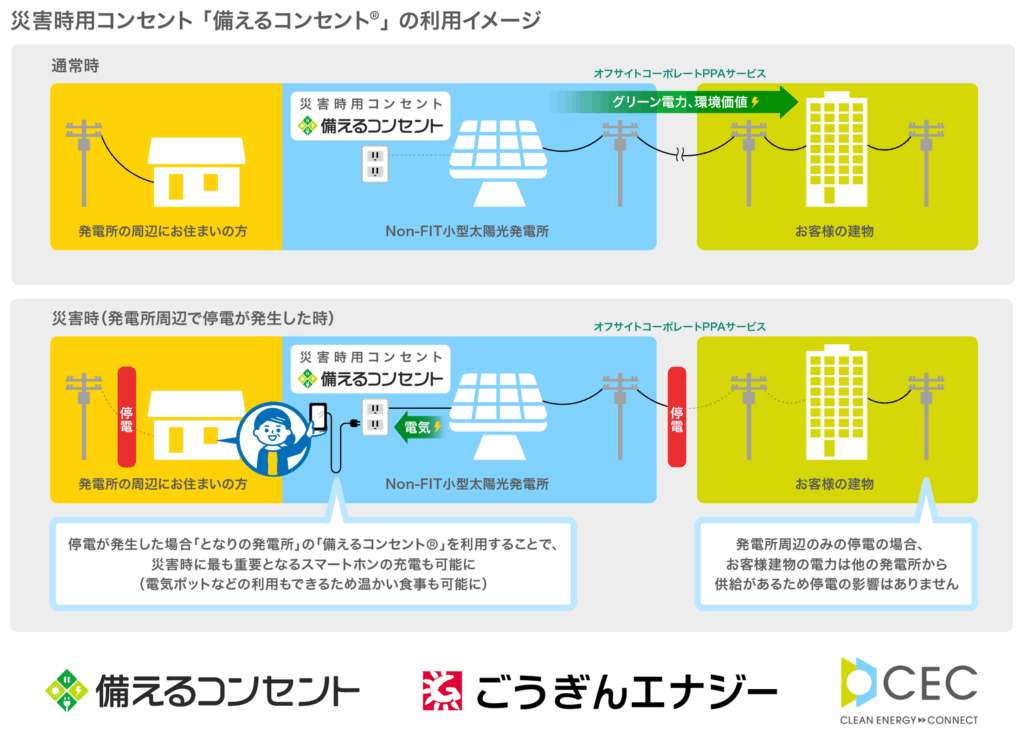 今回開発する山陰合同銀行専用のNon-FIT小型太陽光発電所には、クリーンエナジーコネクトが提供する「備えるコンセント®」を導入しています。「備えるコンセント®」とは、発電所の設置地域で災害等により停電が発生した際、周辺にお住まいのみなさまが太陽光発電で発電した電気を利用できる、災害時用コンセントです。