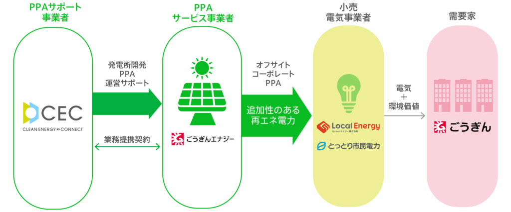 本オフサイトコーポレートPPAサービス(以下、「本サービス」)は、ごうぎんエナジー株式会社が開発した太陽光発電所で発電した電気をローカルエナジー株式会社(代表取締役 加藤 典裕)および株式会社とっとり市民電力(代表取締役 児嶋 太一)が小売電気事業者として、山陰合同銀行の30事業所へ供給します。 本サービスの取り組みにあたり、ごうぎんエナジー株式会社は、株式会社クリーンエナジーコネクト(代表取締役 内田 鉄平)との業務提携契約により、同社から太陽光発電所の開発、電力料金の精算、関係者間の調整などのサポートを受けております。